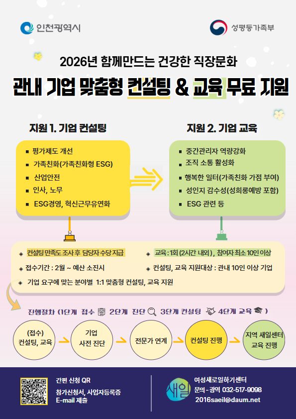 인천광역여성새로일하기센터에서는 관내 기업의 직장문화 개선을 지원하기 위해 컨설팅 및 교육 프로그램을 운영하고 있습니다. 참여를 희망하는 기업께서는 아래 내용을 확인하시어 신청해 주시기 바랍니다.