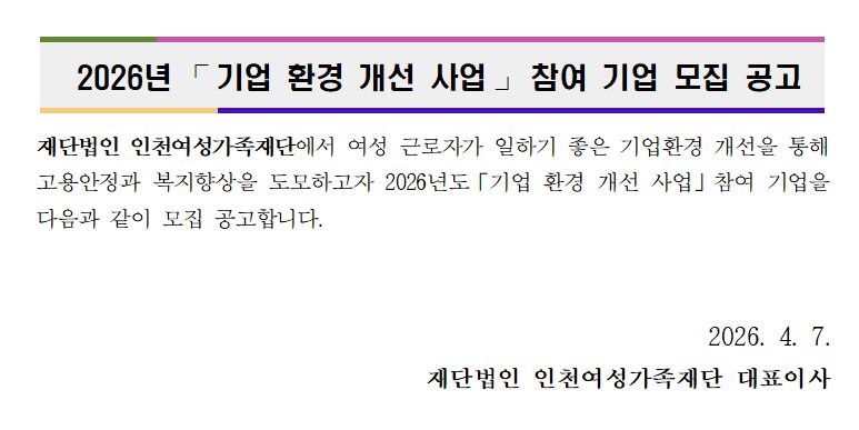 2026년 기업환경개선사업 참여기업 모집 안녕하세요. 부평여성새로일하기센터입니다. 여성 근로자의 고용안정과 복지향상을 위해 2026년 기업환경개선사업 참여기업을 모집합니다.